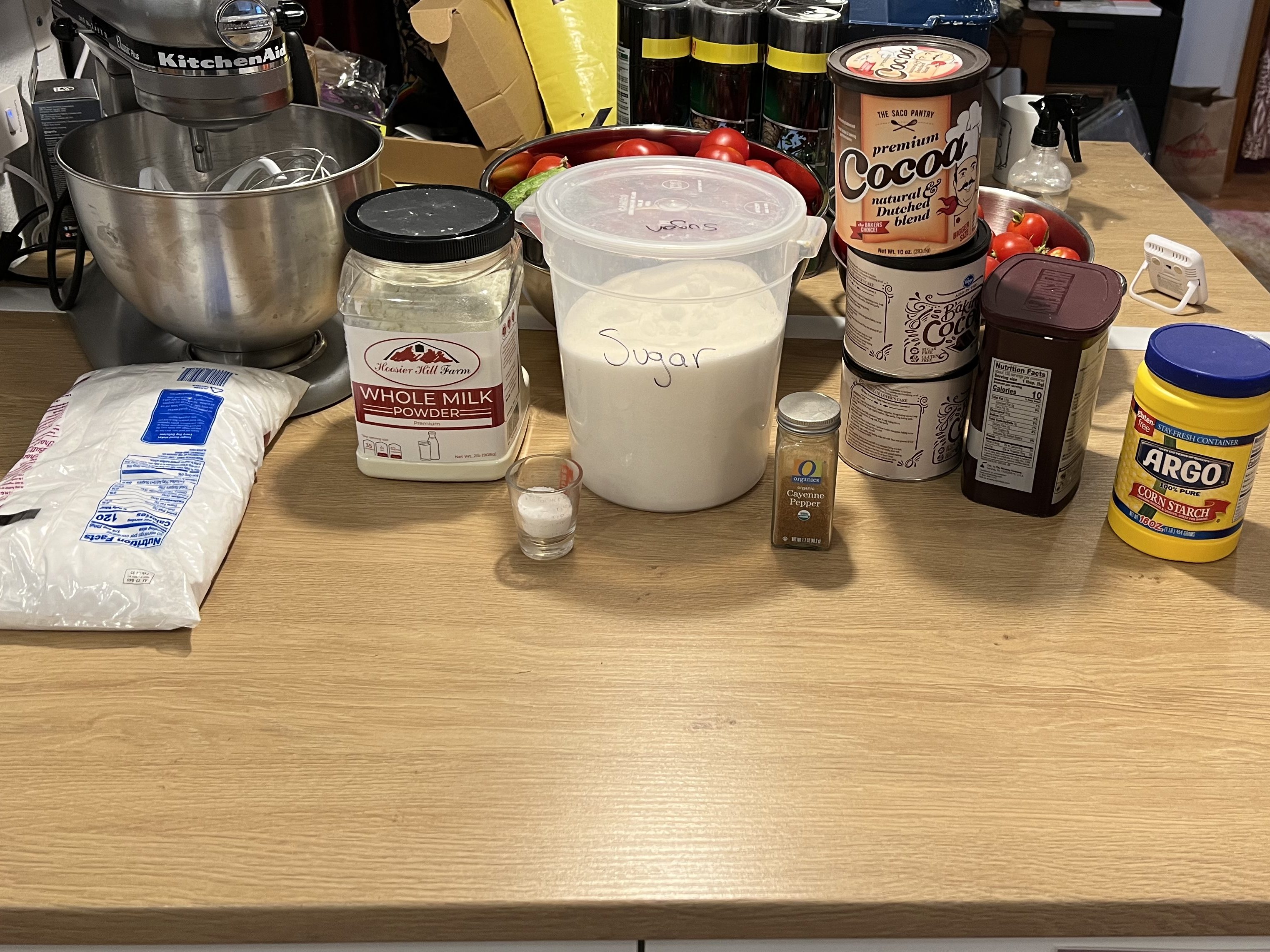 I like to lay out all the ingredients out before I start in case I miss one. Ignore the batch of tomatoes. They just keep growing, so I need to make more tomato sauce. Also ignore I have four tins of cocoa powder. We kept buying it and opening it, and now I have like three half tins and a full one.