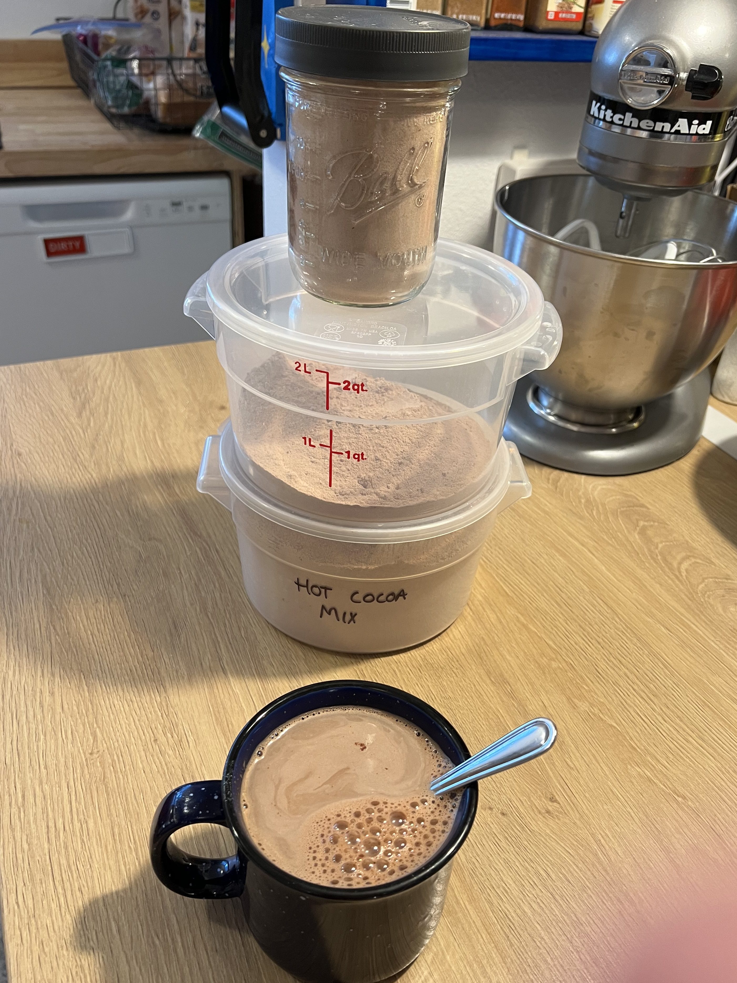Finished mix in containers and one cup of cocoa, and a thumb in the lower right corner because I have fat fumbling fingers. I keep the ball canning jar on the counter, and the rest in the cupboard out of sight.