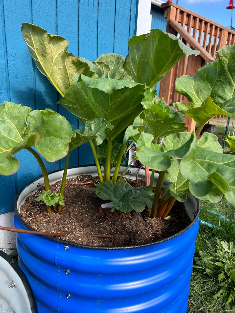My rhubarb has blown up. I just cut down the flowering seed stalk part that was taller than me yesterday. Next to it is an empty bed. With the entire shed ordeal being ongoing, I am just not up to digging it all out, laying down gravel and replacing the beds on this wall of the house right now. Instead I will let my rhubarb and mint go wild and see how I feel about setting that up this winter, after all the sheds are in place and done.