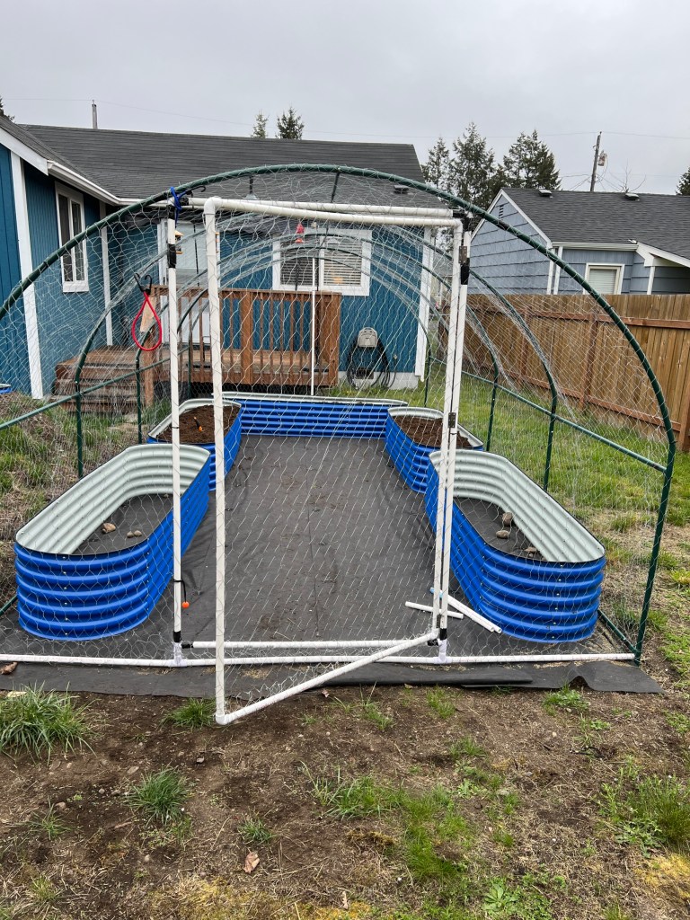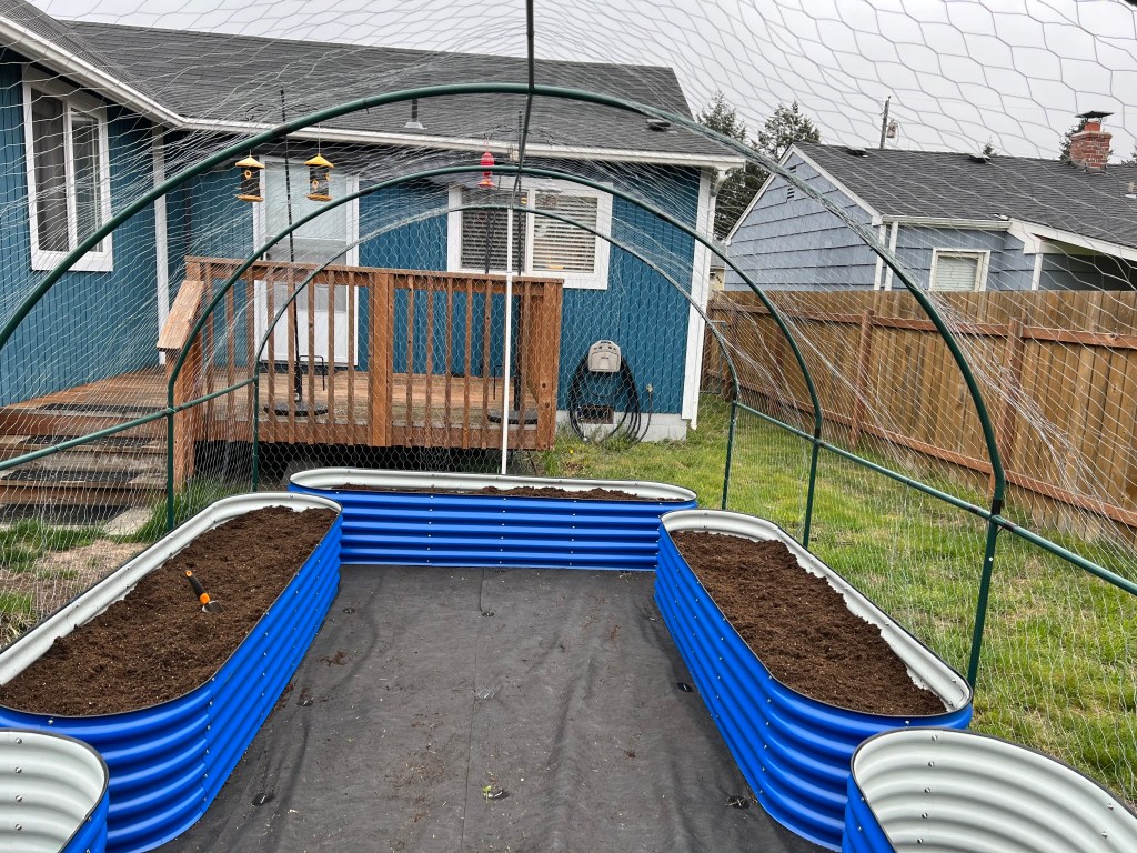 My normal work schedule is Monday through Friday. I took off Thursday, and my wife and I made three trips to Lowes. We got 24 bags of dirt, 12 at a time, and 5 huge bags of beauty bark. As you can see in the pictures the beauty bark filled out the rest of the hoop house aka the Squirrel Interdiction cage.