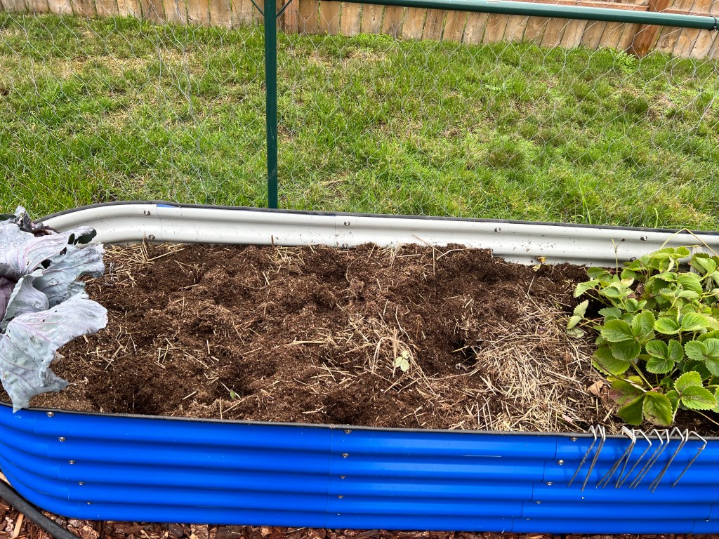 Between the layer of chicken wire and hardware cloth, weeds are growing. They are super hard to remove because of the chicken wire. I have to literally cut back the chicken wire and then pull the weeds. That’s hard for me to do. It requires bending over and my joints just don’t like it. I can do a section, maybe two at a time.